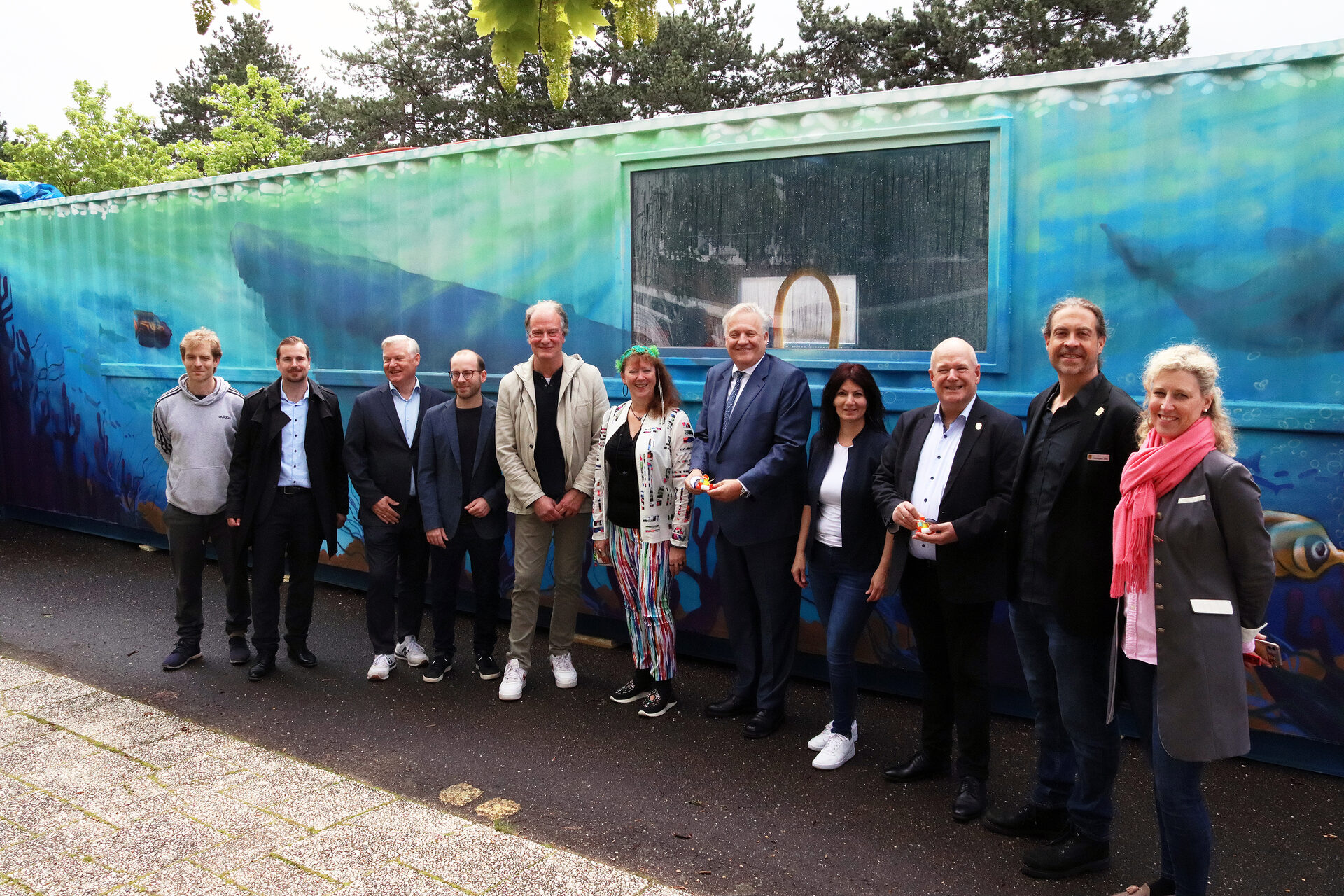 Ein erster Container konnte schon jetzt in Augenschein genommen werden und zwar an der Katholischen Grundschule LeNie im Dürener Stadtteil Lendersdorf. Der etwa zwölf Meter lange und drei Meter breite Container, sowie ein etwas kleinerer angeschlossener Umkleide-Container, war quasi ein Ausblick auf das „narwali“-Projekt, das am 22. Mai in Düsseldorf gestartet wird.