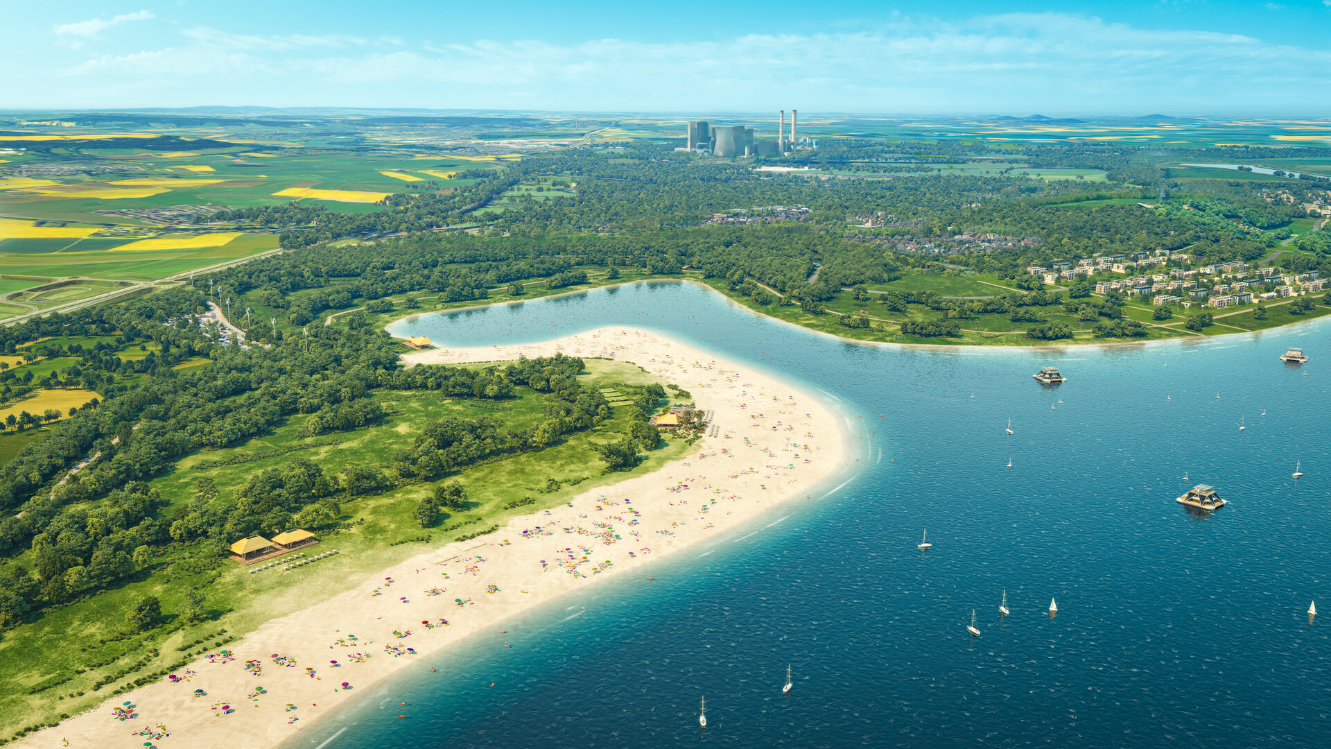 Wir schreiben das Jahr 2035, und der Indesee ist noch lange nicht fertig. Am großen Parkplatz des zukünftigen Strandbads stehen Infotafeln mit Zukunftsbildern. Sie zeigen, wie es rund um die Tagebaugrube in wenigen Jahrzehnten aussehen könnte: 2060 wird die flache Lagune komplett mit Wasser gefüllt sein. Im indeland entsteht ein Badeparadies für Jung und Alt.