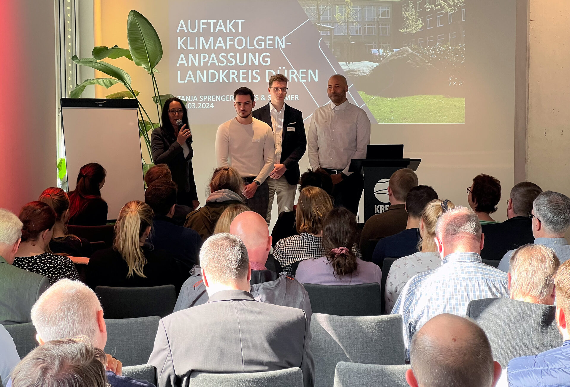 Bei der Auftaktveranstaltung zum Klimafolgenanpassungskonzept sprachen Dr. Tobias Kemper vom Landesamt für Natur, Umwelt und Verbraucherschutz, sowie Tanja Sprenger vom den Kreis Düren begleitenden Institut Drees & Sommer über Möglichkeiten, Städte und Regionen so anzupassen, dass sie möglichst gut mit dem Klimawandel umgehen können. Unter anderem ging es um Begrünung von Dächern und Fassaden, einen intelligenten Umgang mit Wasser und eine Entsiegelung von Flächen.
