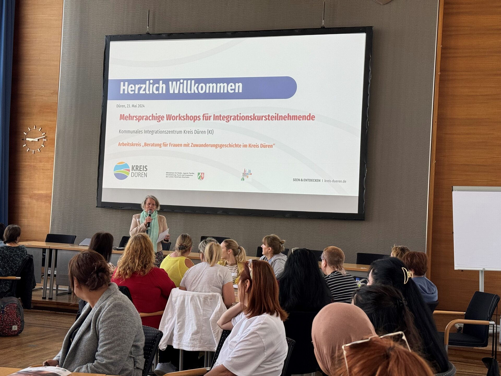 "Nutzen Sie die Gelegenheit, die für Sie wichtigen Infos zu bekommen und Fragen zu stellen. Uns ist es wichtig, dass Sie die Hilfe und Informationen bekommen, die Sie benötigen, um hier im Kreis Düren Fuß zu fassen", sagte Kreis-Dezernentin Sybille Haußmann bei der Begrüßung der vielen Anwesenden. Aus neun verschiedenen Integrationskursen von drei unterschiedlichen Trägern waren Interessierte anwesend.